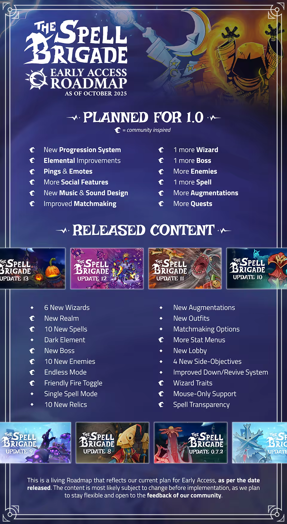 “The Early Access release has all the mechanics considered core to the game, presented in a finished structure that can be played alone or with friends. A selection of worlds, difficulties, modifiers, enemies, wizards, spells, elements, upgrades, items and cosmetics are already present and will be constantly expanded on during Early Access. Players will unlock this gated content in a natural flow by completing challenges. For a more detailed look into the development and planned content of the game, please check out our roadmap below.”