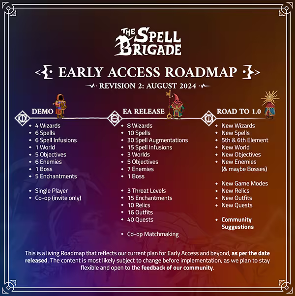 „Die Early Access-Version enthält alle Mechaniken, die als Kernelemente des Spiels betrachtet werden, in einer fertigen Struktur, die allein oder mit Freunden gespielt werden kann. Eine Auswahl an Welten, Schwierigkeitsgraden, Modifikatoren, Gegnern, Zauberern, Zaubern, Elementen, Verbesserungen, Gegenständen und kosmetischen Items ist bereits vorhanden und wird während des Early Access stetig erweitert. Spieler schalten diese Inhalte durch das Abschließen von Herausforderungen frei. Für einen detaillierteren Einblick in die Entwicklung und geplanten Inhalte, schaue dir unsere Roadmap unten an.“