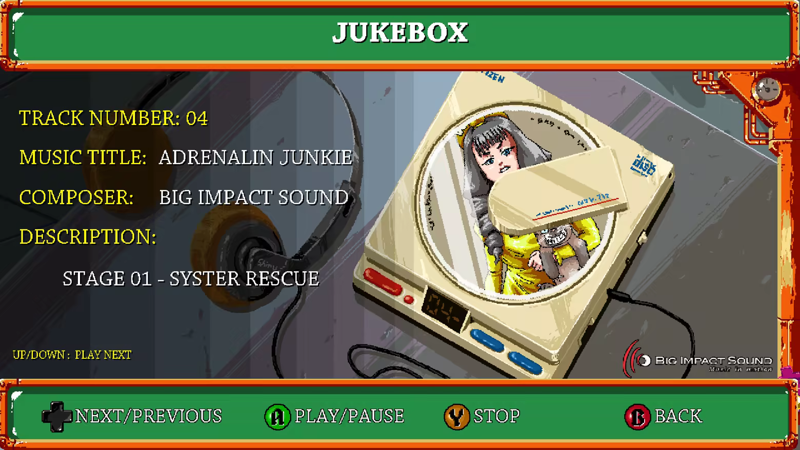 • Jukebox: where you can enjoy the full soundtrack made by the amazing Big Impact Sound.
