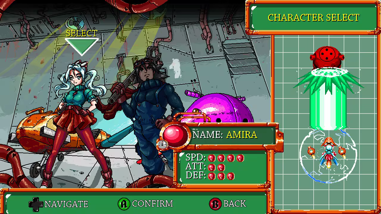 • Two different players: Each play has their own playstyle. Amira: is the more traditional shmup player. Collects items and power ups to get stronger. Turbo B: is more of the charge and wait style, he gets stronger by shooting enemies down.