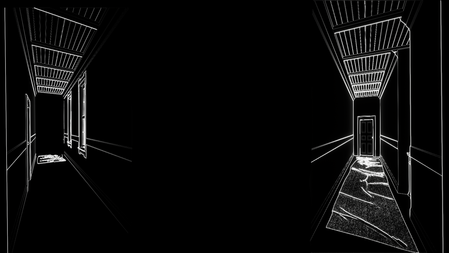 You are in a dark, repetitive hallway without light. This is a walking simulator where you navigate through the darkness using echolocation.