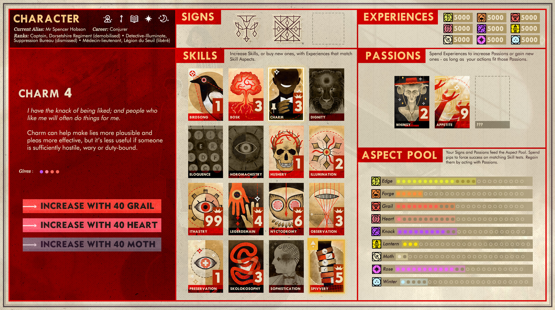 • BUILD your character from sixteen very different skills. Dignity is essential for physicians who need to be taken seriously. Spivvery is the only way to ensure a hot meal in a cold world. Any writer will tell you that Sophistication is useful, somehow. And everyone knows Skolekosophy is the study of things that shouldn't be studied.
