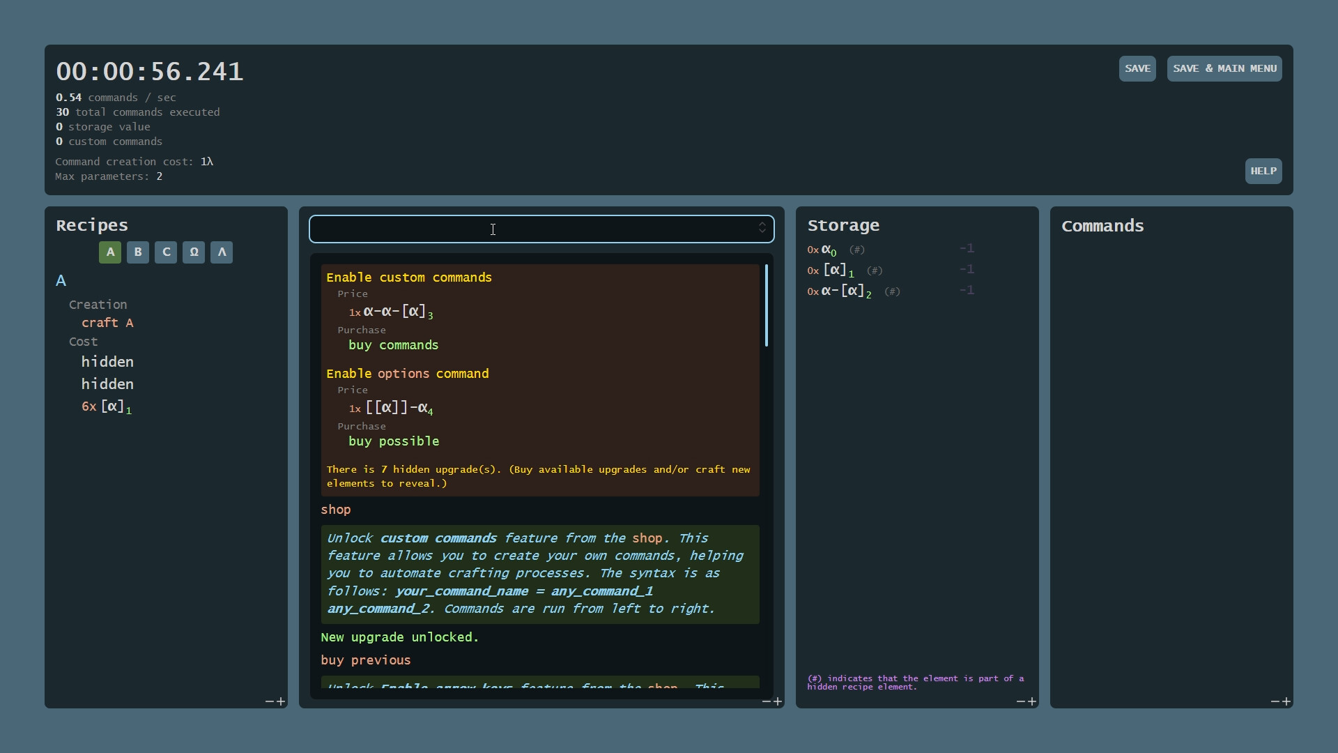• You can create custom commands to automate your game. For example 'g = generate generage' creates command g, which executes generate-command twice.