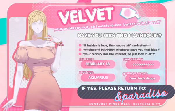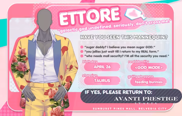“Plastic Trick” is a choice-driven, visual novel where you play as a shopaholic named Serena - who's having a delulu romance with plastic mannequins that have come to life and are fighting for your kiss.