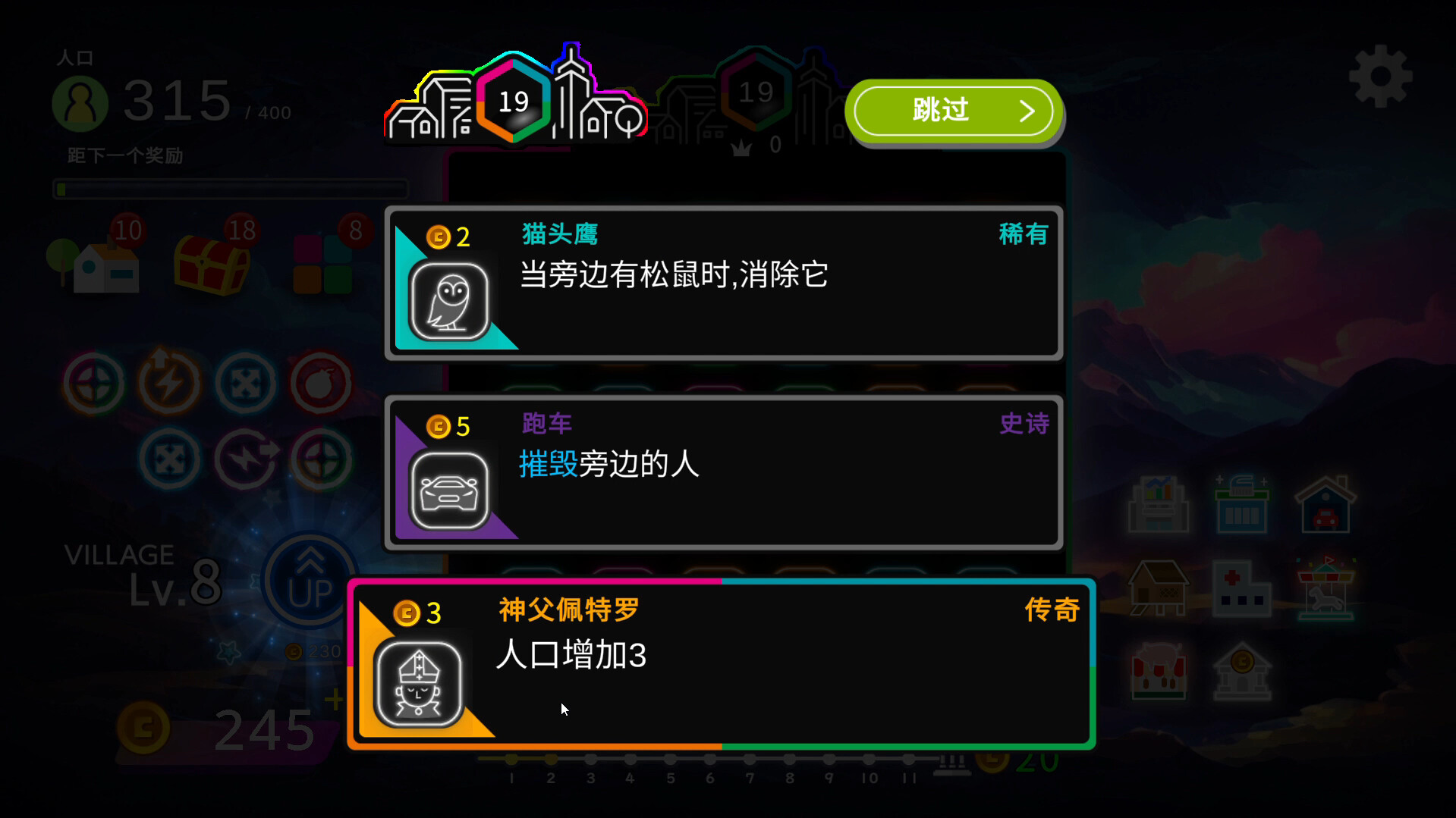 本作是一款融合了「卡组建构型Roguelike」与「三消拼图」的游戏。 收集个性丰富的居民,激发爆炸性的协同效应,让你的村庄在霓虹光芒中发展!