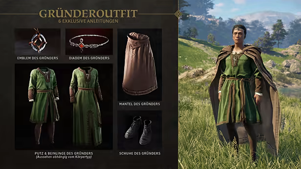 Füge das Gründeroutfit deinen Handwerksoptionen hinzu: 6 exklusive Anleitungen (Emblem, Diadem, Mantel, Putz, Beinlinge und Schuhe des Gründers). Mit diesen exquisiten Gewändern können sich Gründer von der Menge abheben.