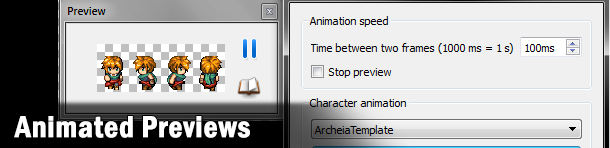 Game Character Hub's Preview window lets you see whats going on without having to stop what you're doing! You can pause the animation and change different settings such as the animation speed, background color and even zoom! You can also set custom animation previews with the Animation Management feature. Useful if you want to see if your Autotiles or Behaviour poses seamlessly transition to one another!
