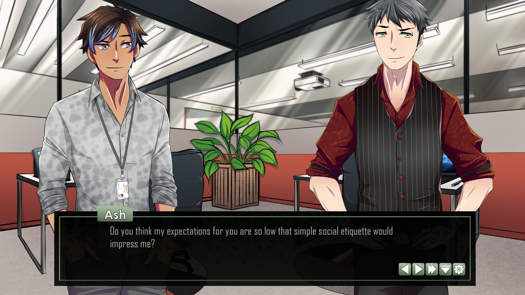There are three explicit sex scenes (one fellatio, one handjob, and one penetration) in the 18+ story route. All scenes are between two consenting male adults. These scenes are not present in the SFW route.