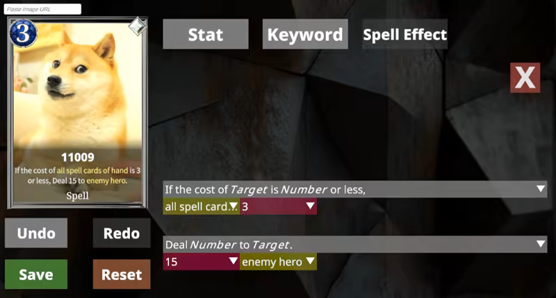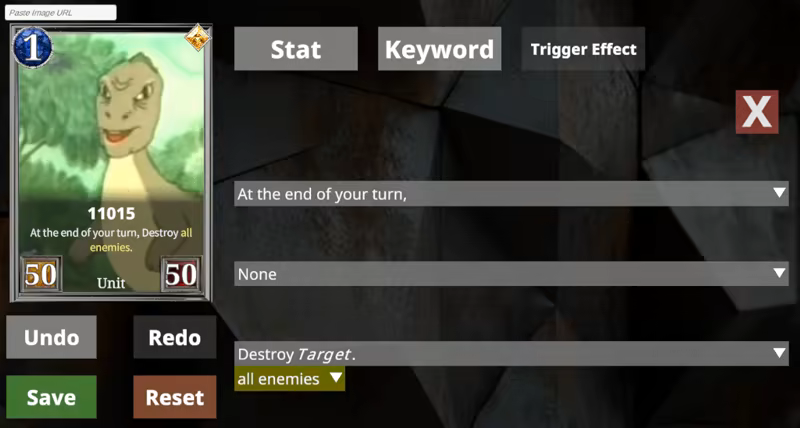 Custom card functions are also available to specify direct illustrations, ability values, and effects.