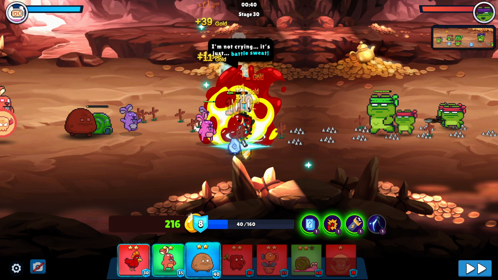 Defend your captain using units to fight off invading frogs. Level up your units to unlock their new abilities, purchase upgrades, and gain special abilities to win battles against the invaders.