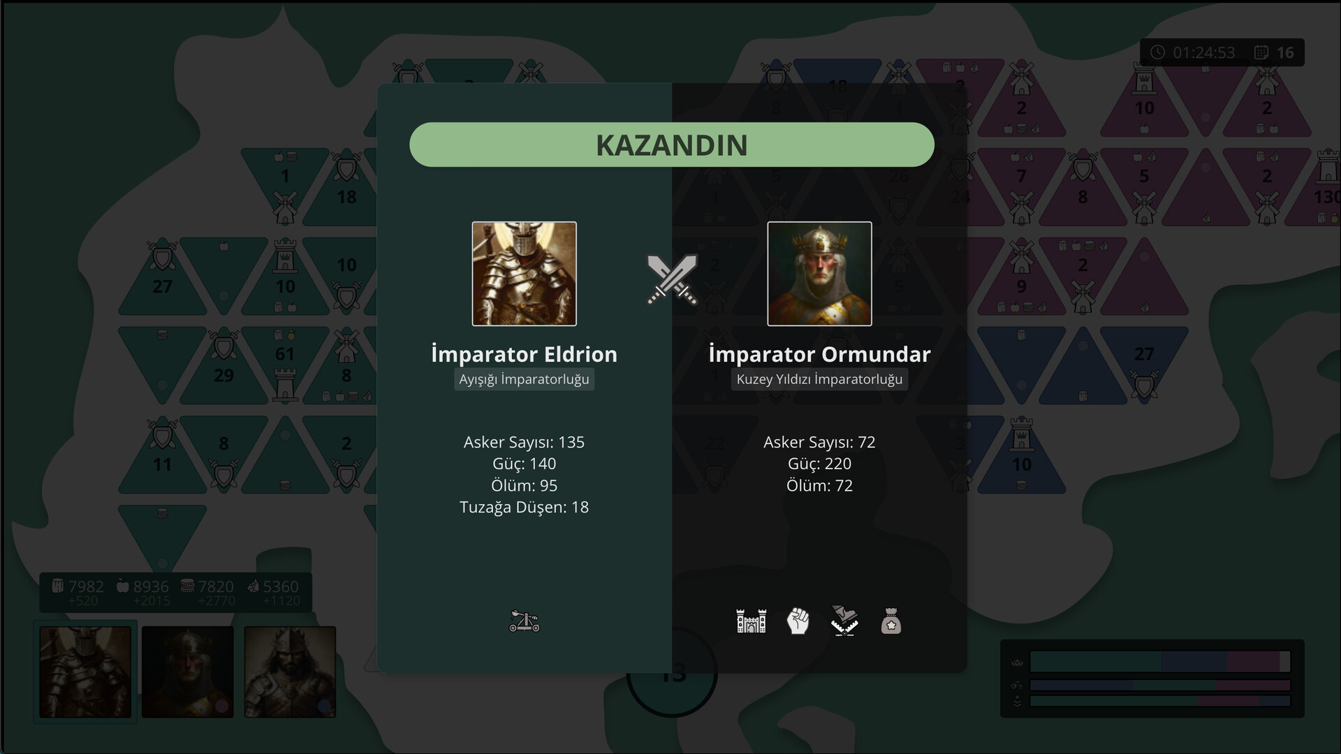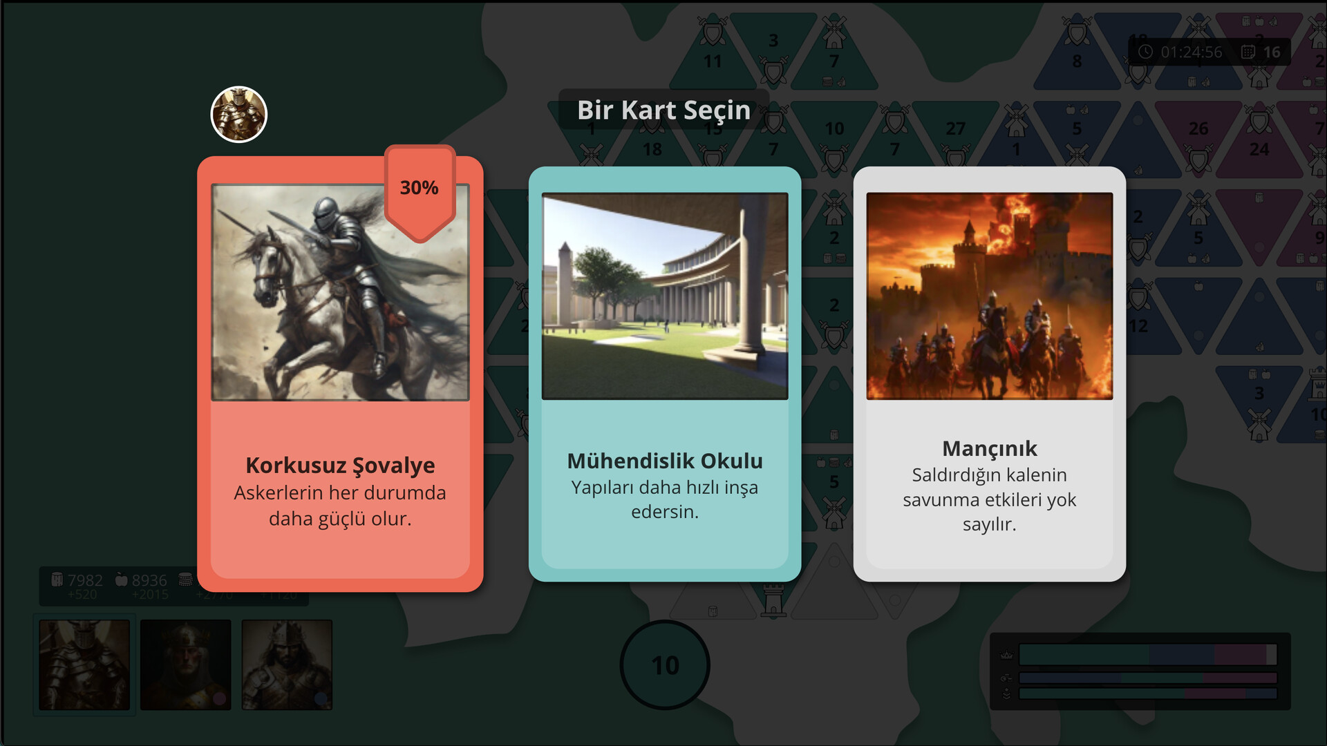 • Kart Seçme Mekaniği: Güçlü kartlar toplayarak krallığınızın ekonomisini, ordusunu ve savunmasını güçlendirin.