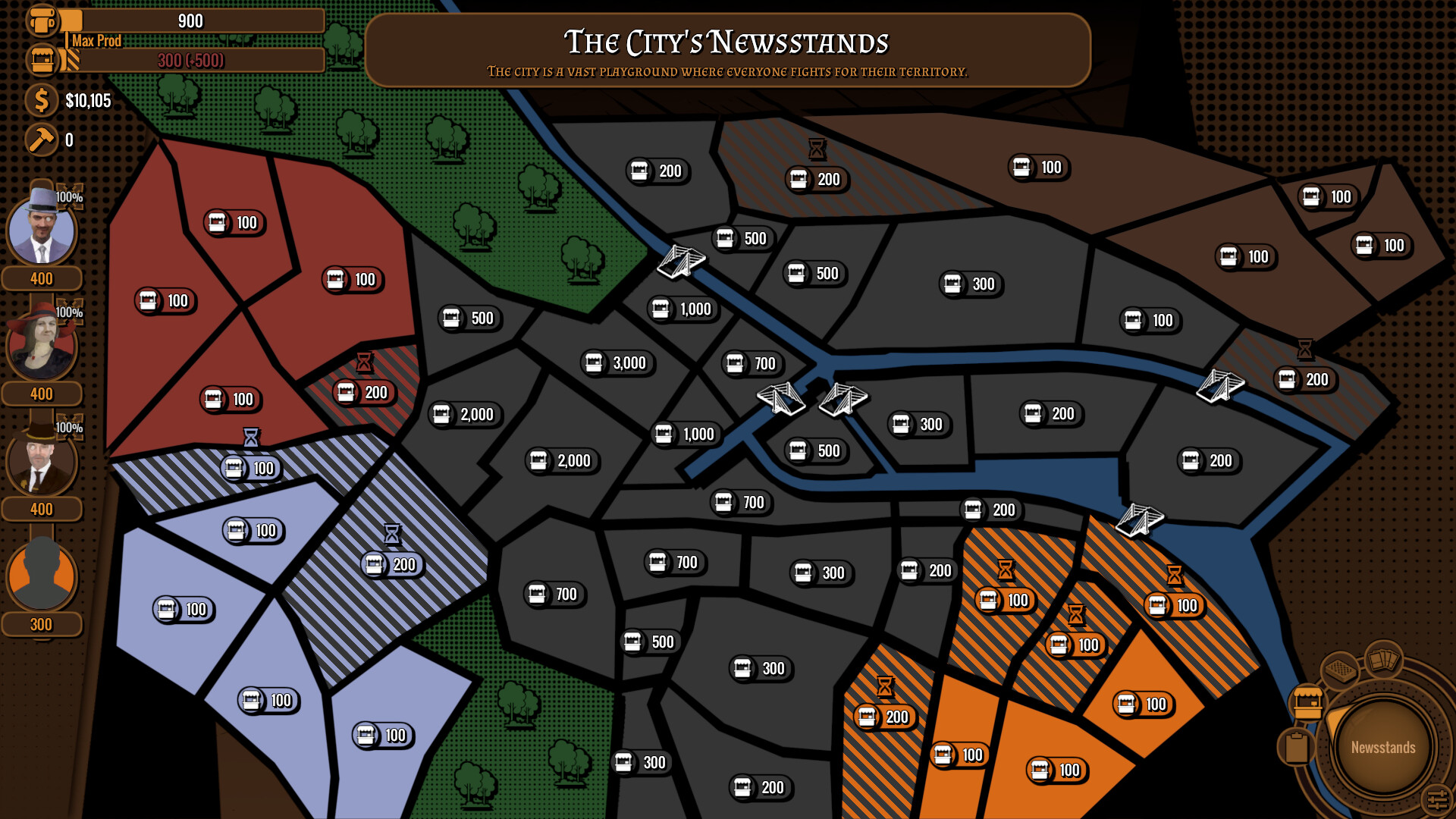 At night, you’ll have to protect yourself from rival newspaper bosses trying to harm you. But if you want to own the biggest paper in the city, you’ll also have to attack them using underworld services.