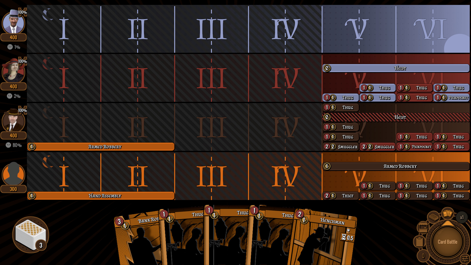 As you progress, you’ll meet new characters. Each of them offers different services focused on a specific gameplay style. The Underworld Boss, for example, offers basic services like thugs (orange cards), while the Politician offers more protection-oriented services (blue cards).