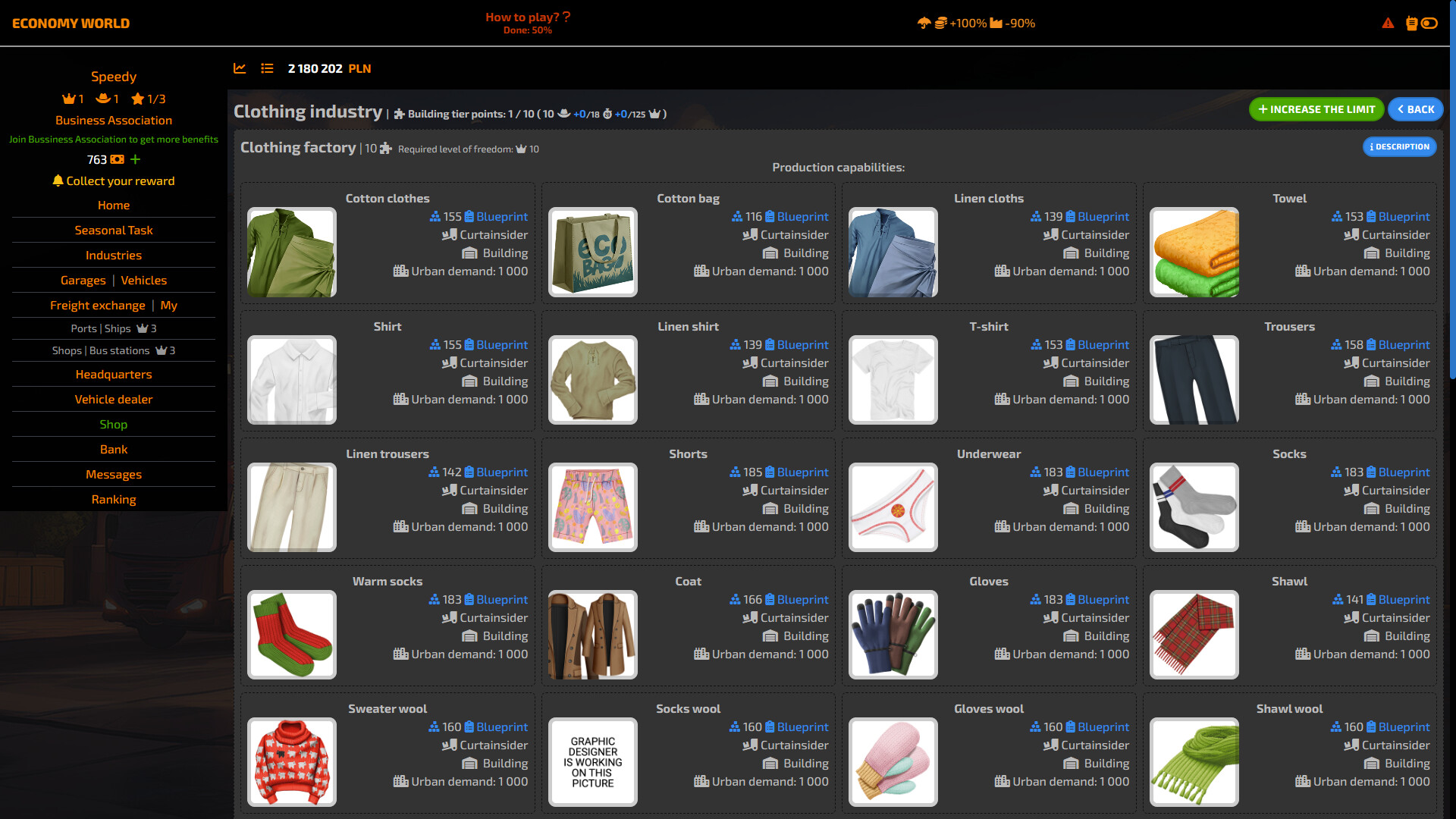Economy world is a real-time strategy where, together with other players, you try to gain the widest possible market share for your products. You start with simple grain production or mining resources in a mine and try to reach the top, which are bakeries, car or computer factories. It is up to you what direction your company will go. The game has a natural supply and demand game, so other players have an impact on the profits we earn. The raw materials we need can be on different continents, then we will be forced to build ports and buy ships that we will transport to our factories.