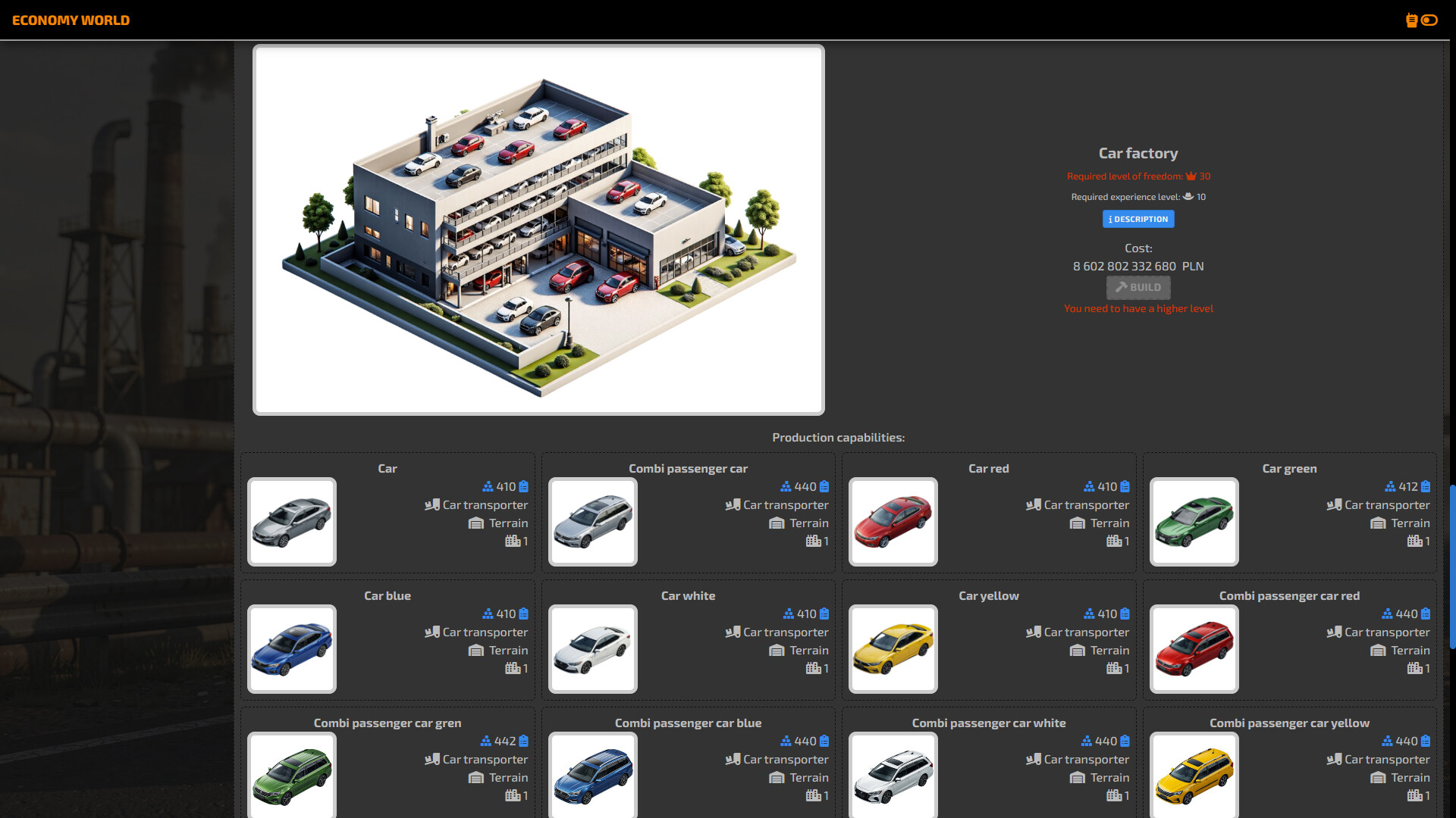 Economy world is a real-time strategy where, together with other players, you try to gain the widest possible market share for your products. You start with simple grain production or mining resources in a mine and try to reach the top, which are bakeries, car or computer factories. It is up to you what direction your company will go. The game has a natural supply and demand game, so other players have an impact on the profits we earn. The raw materials we need can be on different continents, then we will be forced to build ports and buy ships that we will transport to our factories.