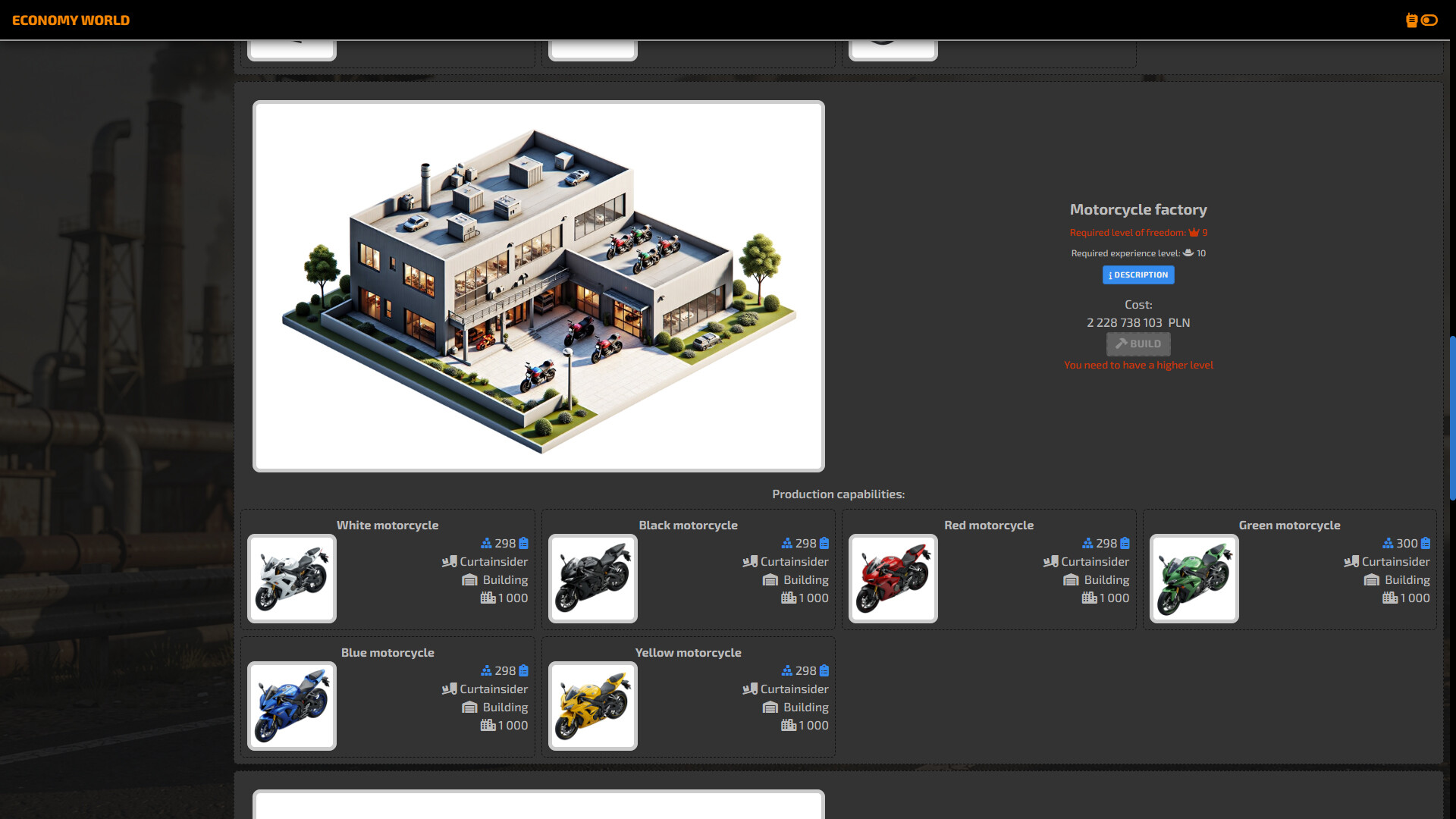 Economy world is a real-time strategy where, together with other players, you try to gain the widest possible market share for your products. You start with simple grain production or mining resources in a mine and try to reach the top, which are bakeries, car or computer factories. It is up to you what direction your company will go. The game has a natural supply and demand game, so other players have an impact on the profits we earn. The raw materials we need can be on different continents, then we will be forced to build ports and buy ships that we will transport to our factories.
