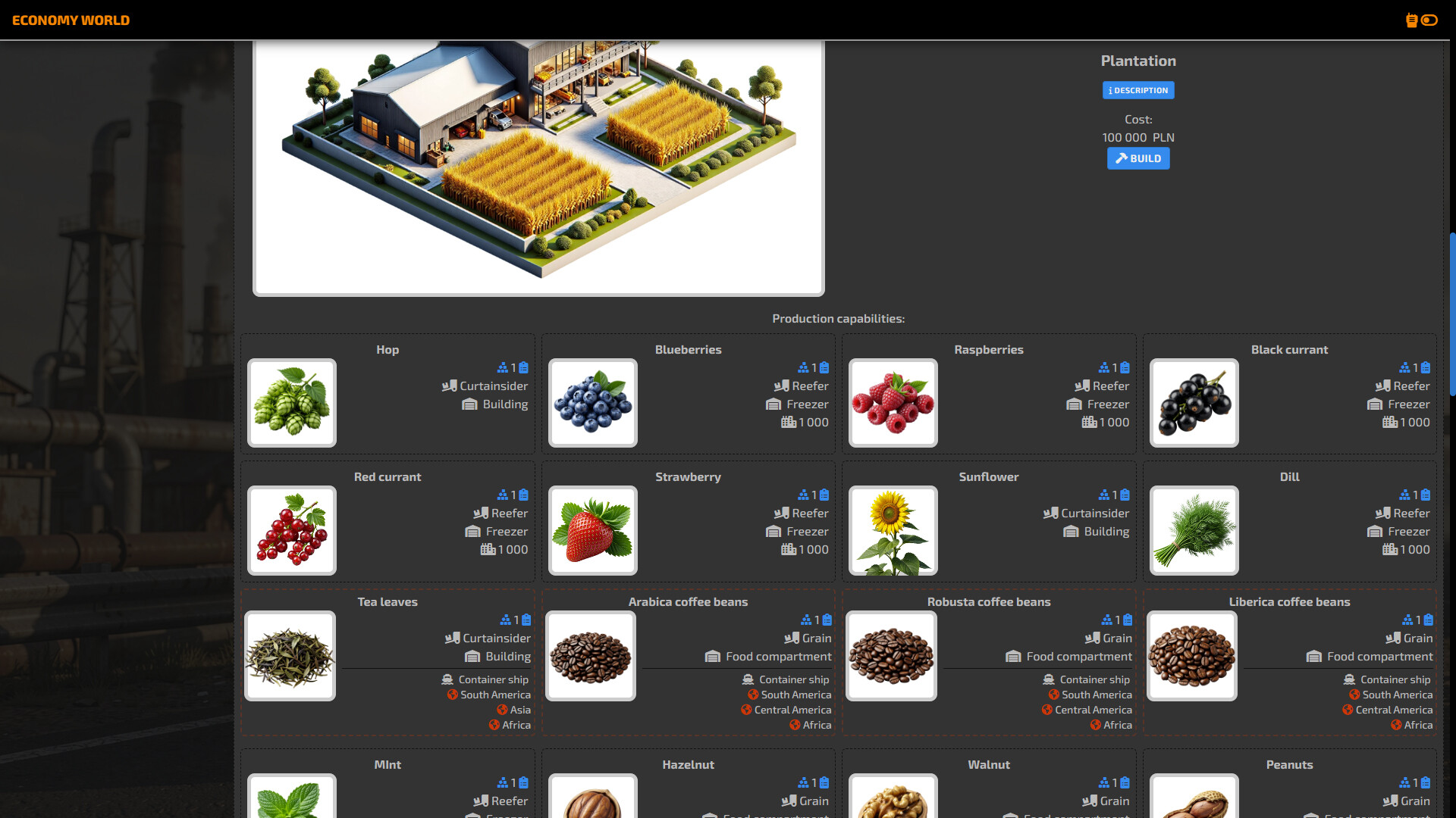 Economy world is a real-time strategy where, together with other players, you try to gain the widest possible market share for your products. You start with simple grain production or mining resources in a mine and try to reach the top, which are bakeries, car or computer factories. It is up to you what direction your company will go. The game has a natural supply and demand game, so other players have an impact on the profits we earn. The raw materials we need can be on different continents, then we will be forced to build ports and buy ships that we will transport to our factories.