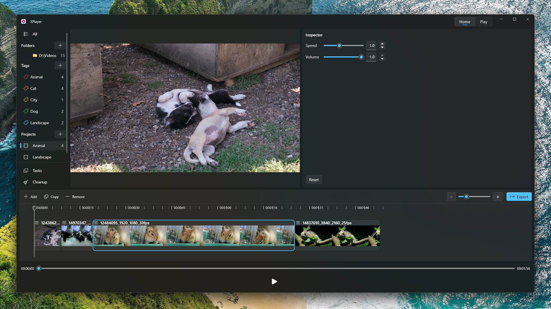 XPlayer allows you to intuitively browse your local media and tag your favorite clips. Watch them in Play View, or create a project from tags and export it as a video file.