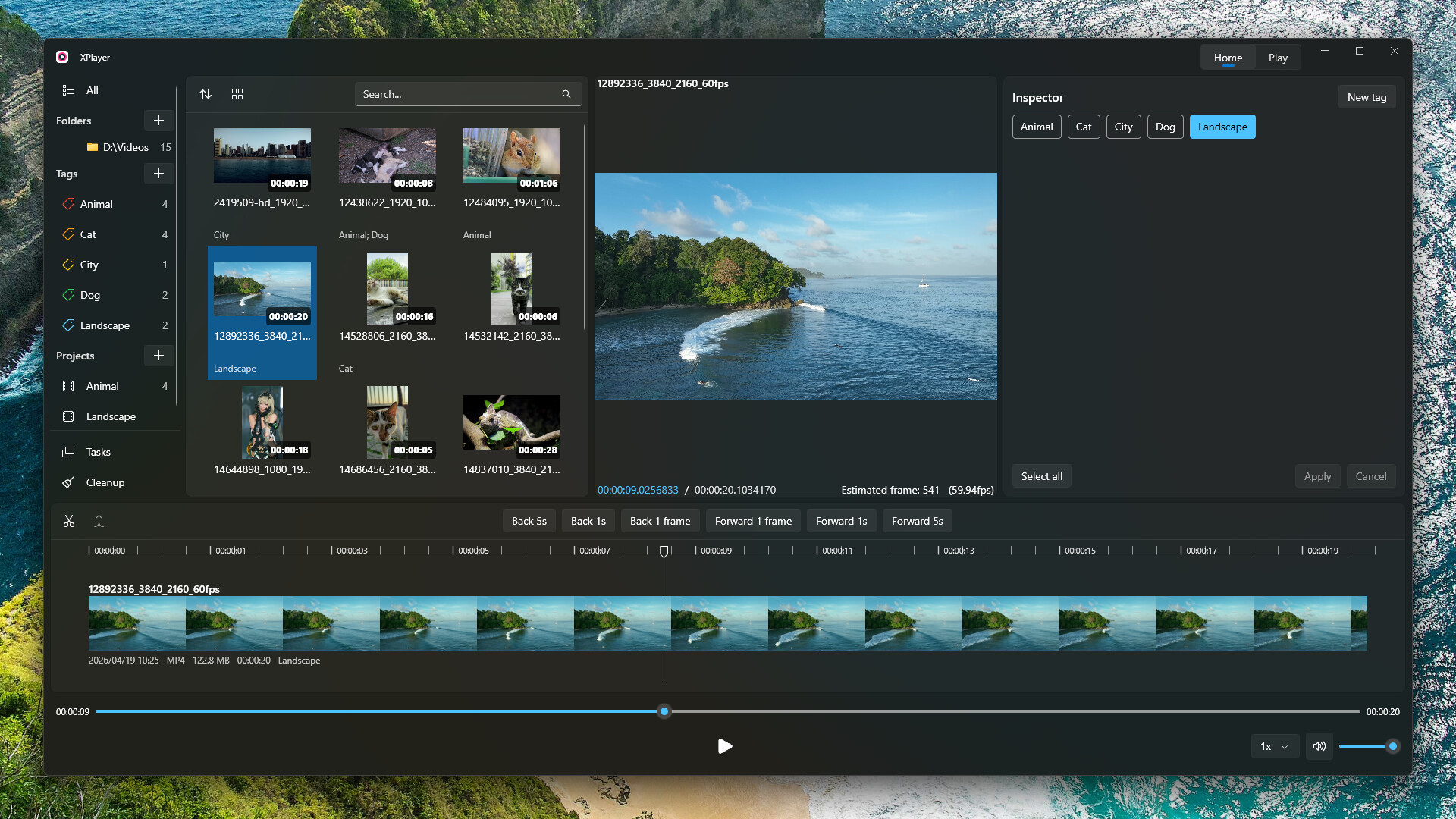 XPlayer allows you to intuitively browse your local media and tag your favorite clips. Watch them in Play View, or create a project from tags and export it as a video file.