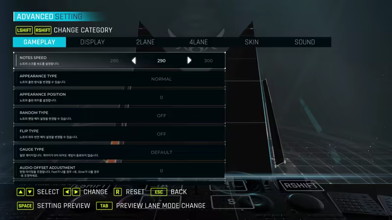 세밀한 게임 옵션을 통해 판정 타이밍 조정, 하이스피드 설정 등 다양한 조정이 가능합니다.