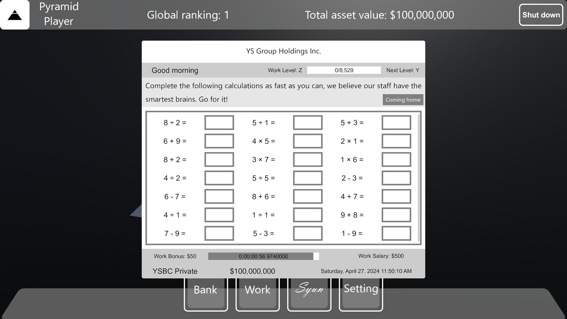 When you enter the game, you will be given a corresponding bank account that will immediately arrive with a sum of money, which will be your initial funds. The bank account will be determined by the level of bank you purchase, with the game itself plus the 5 DLCs totaling 6 different levels of bank accounts, and the initial amount of money arriving being the minimum daily closing balance for that level of bank account. Please note that purchasing the DLC does not add wealth to your existing assets, the 6 bank levels generate 6 separate game archives. Because we are not looking for players to increase their wealth in the game by purchasing the DLC, but rather these 6 initial funds symbolize 6 different classes of birth, we want players to experience if the different classes of birth will affect where they end up. Some of our DLC is very expensive, even though we know that players are fully capable of buying it, but we do not want players to buy it, but as a contrast, our original intention is to let players understand that even if they are born with a low starting point, they can still through their own hard work and wisdom finally arrive at a position that belongs to them, maybe in the end, this position is very high, maybe not so high, but both are the most suitable for them, the most admirable. Similarly, even if you were born with a high starting point, it's not easy to maintain your position all the time. Please remember that you will only have this initial amount of money and we will not add any microtransactions to increase your wealth, as the original purpose of this game was to ensure absolute fairness for all players. You can earn salary through different jobs, the current job is some completely randomly generated math calculations and English words, you can choose different number of questions or words and difficulty range to earn the corresponding salary, regularly do these jobs believe that you will be able to get a great enhancement of your personal ability in reality.