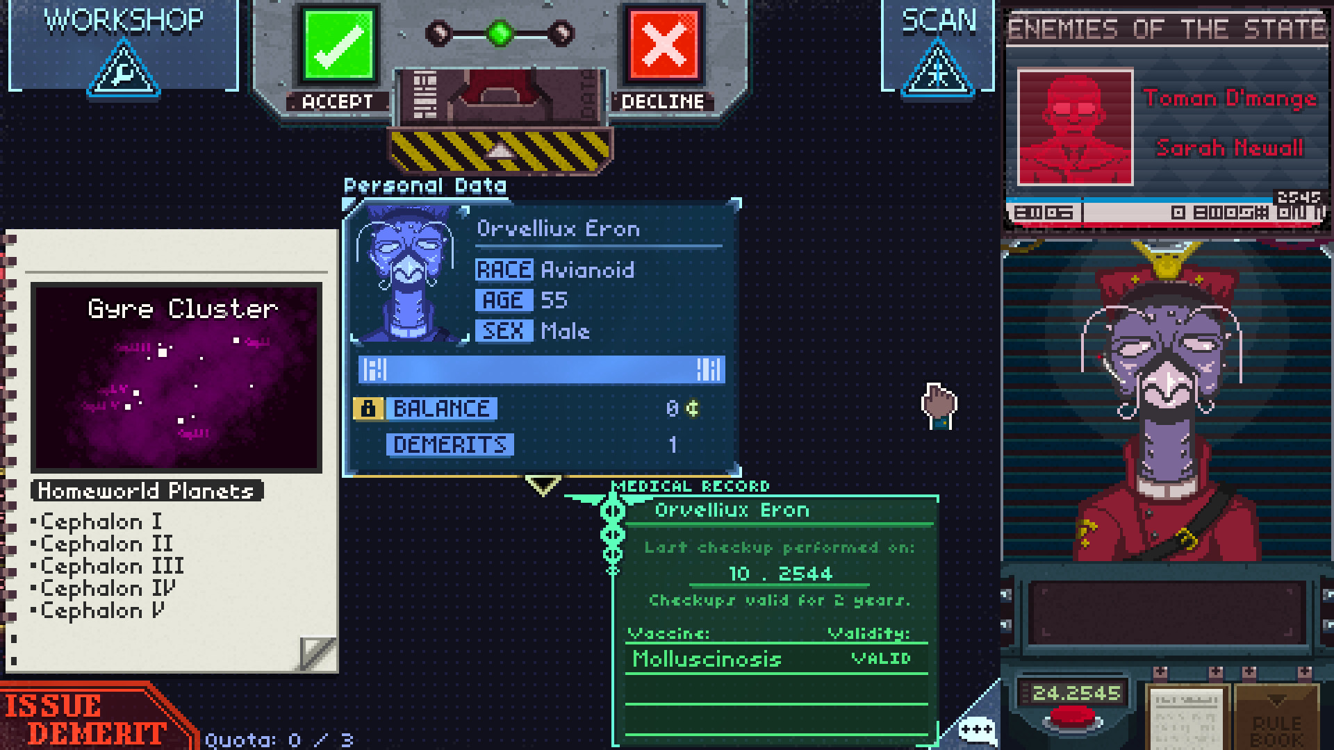 Compare documents for inconsistencies, repair ship systems and ultimately allow or disallow travel. All the while the OCA is piling on more and more bureaucratic red tape in this puzzle, management life-sim.