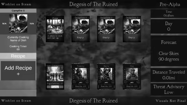 This is a single-player game. You will be in control of the surviving community which will wander throughout the lands trying to survive as long as possible while facing random dangerous events and encounters. Once you die it will be game over because the game is permadeath, and once you die the game will say how long you survived.