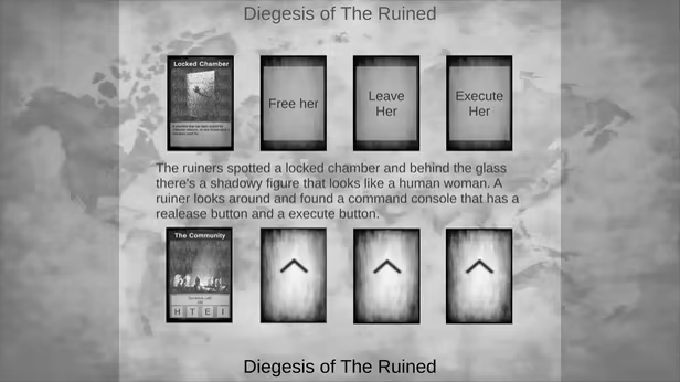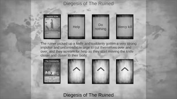 This is a dark Christian-based post-apocalyptic survival card game with RPG elements, that is a retelling about the last community of Survivors (aka the ruined/ruiners), who were traveling the lands to survive and in search of a safe place from the horrors that have come upon the earth, which were born from the sins of humanity (think of the SCP, Backrooms, internet horror archive type of universe, just without the long reads and stuff).