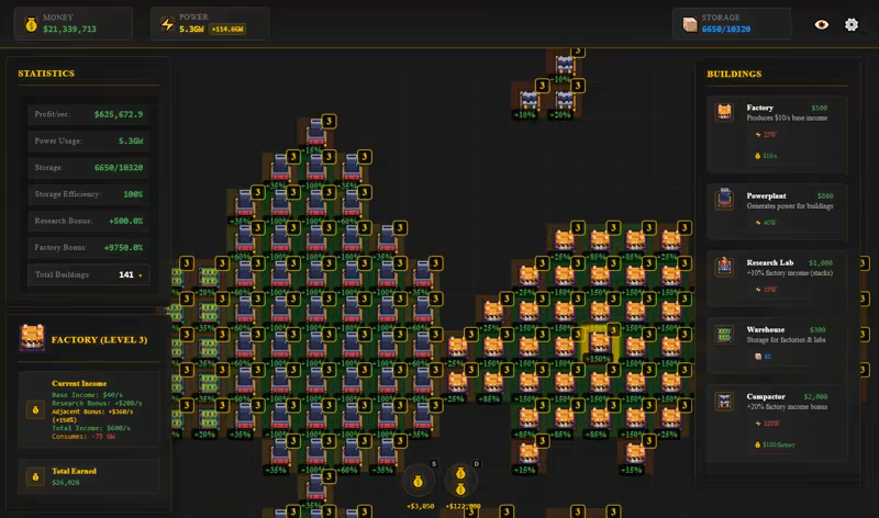 Build and optimize your industrial empire in this grid-based idle game. Place factories, power plants, and research labs strategically to maximize efficiency through adjacency bonuses. Upgrade your buildings, manage power consumption, and watch your profits soar while you're away.