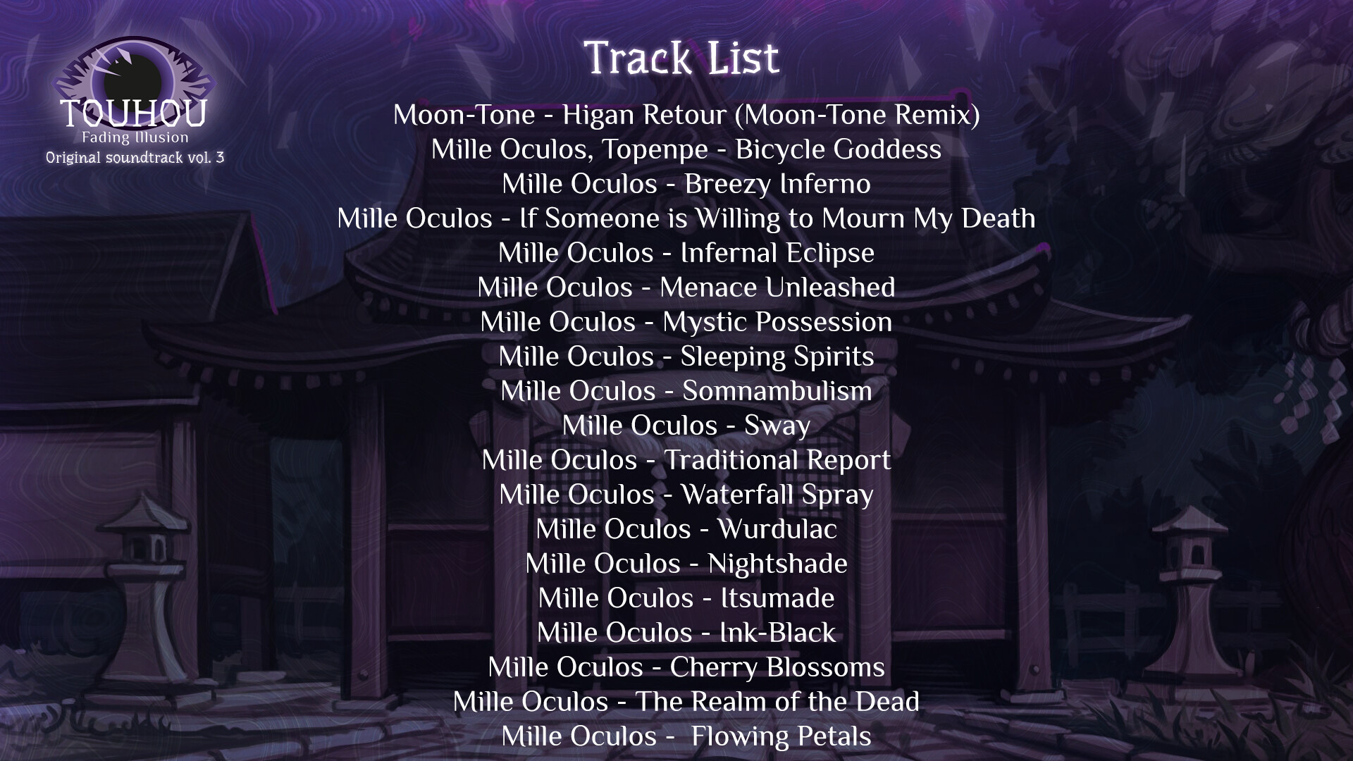 Esta es la tercera parte de la banda sonora de Touhou: Fading Illusion. Aquí hay 18 pistas de Mille Oculos y 1 pista de Moon-Tone.