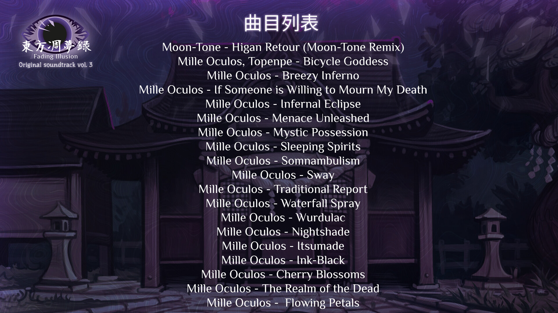 這是《東方凋夢錄 ~ Fading Illusion》的第三張原聲專輯,包含由 Mille Oculos 創作的18首原聲音樂,以及 Moon-Tone 創作的一首原聲。
