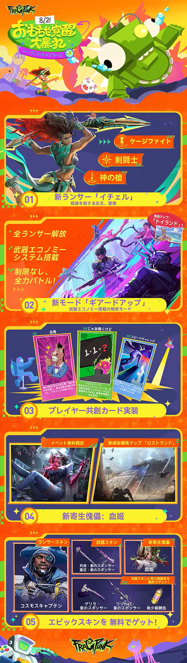 独自のスキル、個性、そしてユニークなボイスを持った13人の個性的なランサーたちが登場。ロケットランチャーで敵を吹き飛ばす?トラップを仕掛ける?ステルスで奇襲?ドローンタンクを操作?可能性は無限大!新ランサー登場——チャム!彼と、彼の相棒である伝説のペットフィッシュチョンパーが、敵に壊滅的な攻撃を仕掛ける準備を完了!