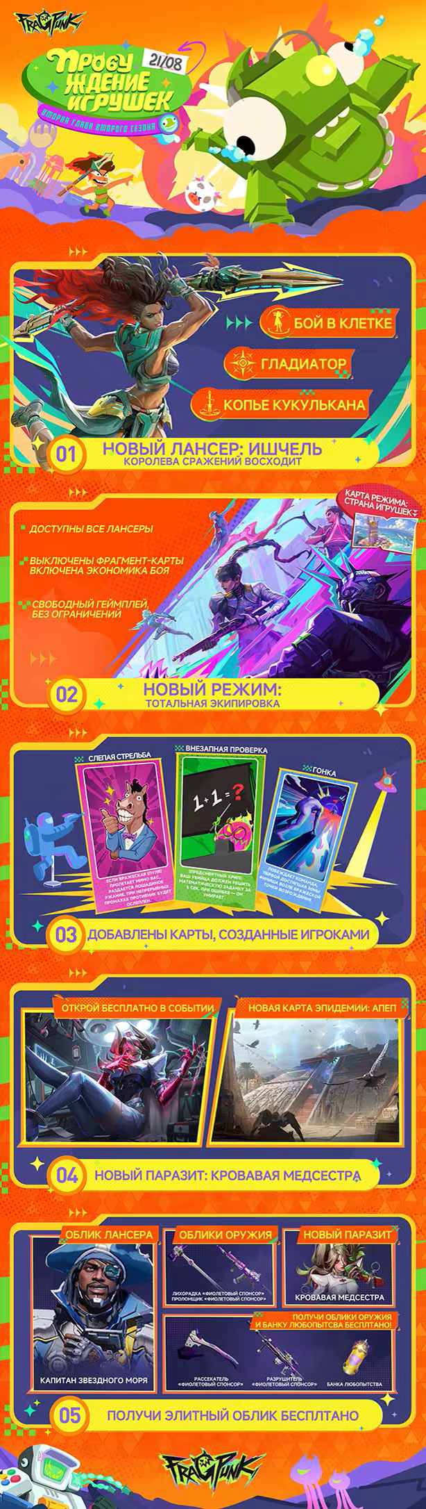 Погрузитесь в экшен FragPunk и нарушайте правила более чем со 150 фрагмент-картами! Хотите «мотивировать» союзников? Палите по союзникам, чтобы они быстрее бегали и стреляли! Нужно восстановить здоровье? Присядьте, снесите яйцо и съешьте его! С фрагмент-картами можно нарушить любое правило. Карты комбинируются, нейтрализуют друг друга и добавляют в классический геймплей «подрыв» новую тактическую глубину. Причем каждая фрагмент-карта полностью и навсегда бесплатна для всех игроков — никаких платных ограничений! Врывайтесь в игру FragPunk и откройте для себя мир безграничных возможностей!