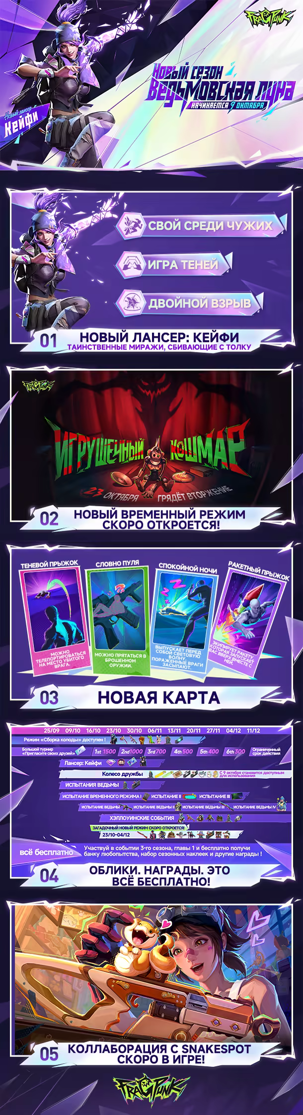 Погрузитесь в экшен FragPunk и нарушайте правила более чем со 150 фрагмент-картами! Хотите «мотивировать» союзников? Палите по союзникам, чтобы они быстрее бегали и стреляли! Нужно восстановить здоровье? Присядьте, снесите яйцо и съешьте его! С фрагмент-картами можно нарушить любое правило. Карты комбинируются, нейтрализуют друг друга и добавляют в классический геймплей «подрыв» новую тактическую глубину. Причем каждая фрагмент-карта полностью и навсегда бесплатна для всех игроков — никаких платных ограничений! Врывайтесь в игру FragPunk и откройте для себя мир безграничных возможностей!