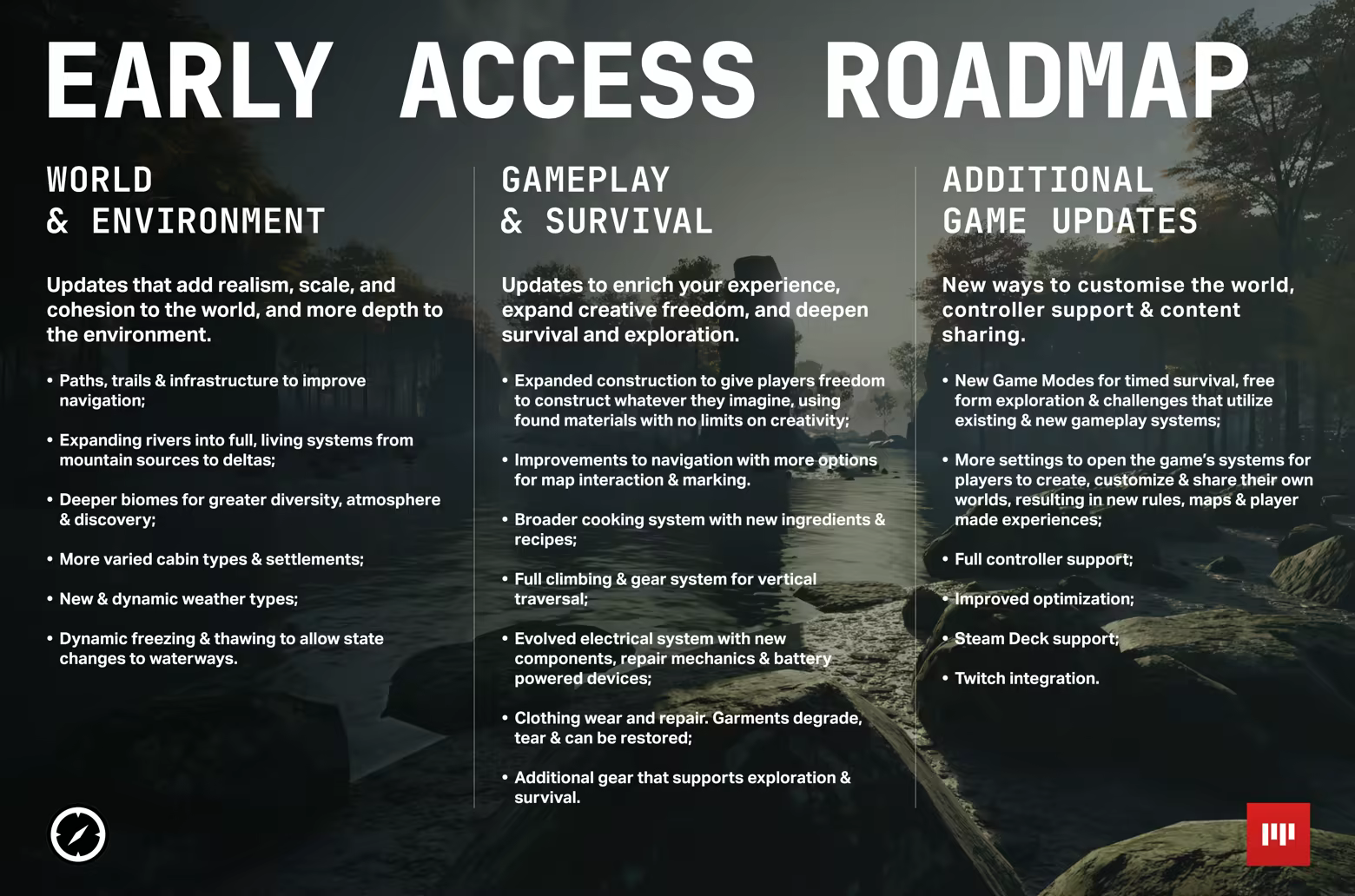 “We plan to make the full version of Prologue: Go Wayback! a much deeper experience than it is today. We will enrich the natural environments with deeper biomes, expanded rivers, new weather types, and improved navigation with paths and trails. We will deepen survival mechanics, add new gear and iteams, introduce new game modes, and give players more customization options to tailor how they want to play.”