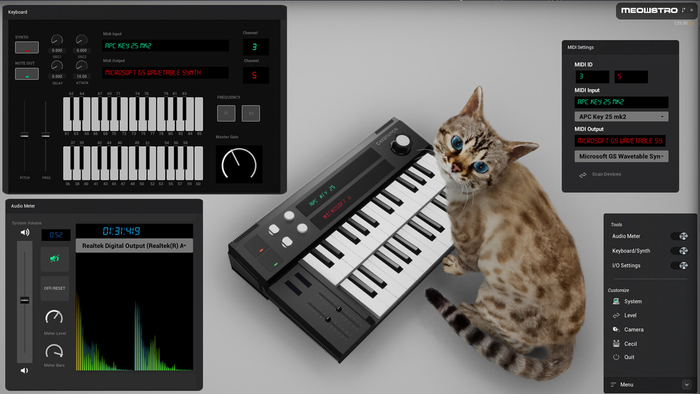 You are a cat with a piano and synthesizer made just for you! Meowstro is designed to be a versatile MIDI interface, allowing you to play using MIDI inputs and outputs. Humans can also interact with it using a standard PC keyboard.