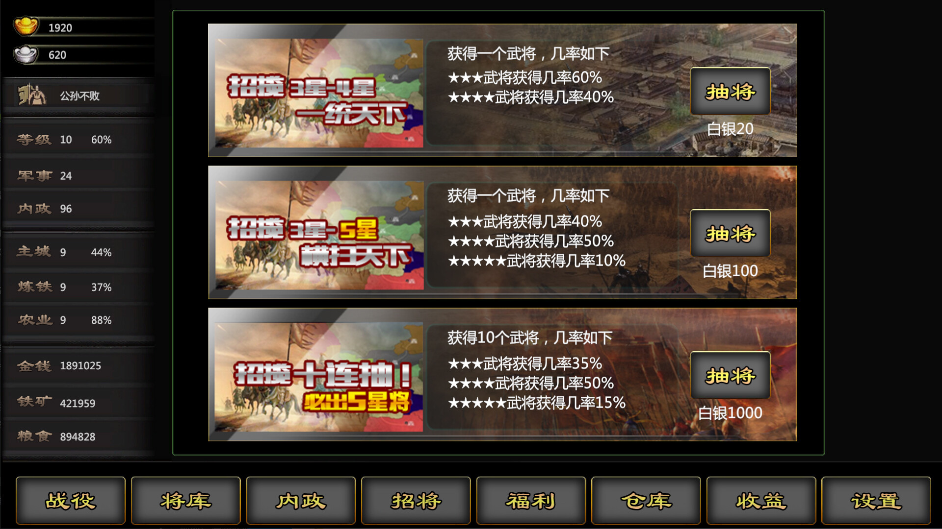战役系统:挑战的战役越多,除了后面每天白银收益也会越高之外还有机会招降更极品的武将