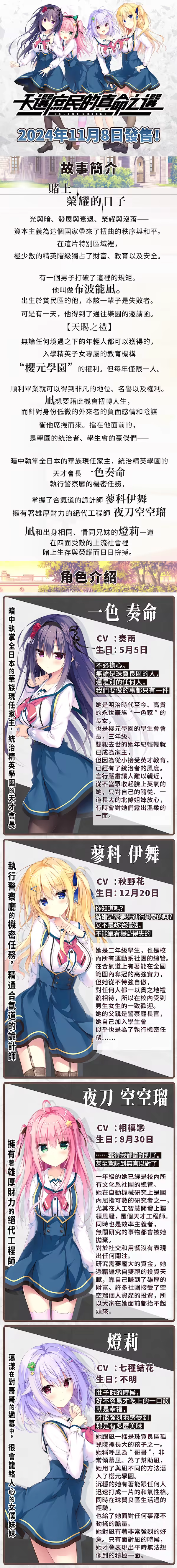 《天選庶民的真命之選》是由日本美少女遊戲人氣品牌 Madosoft(窗社)的最新力作。Steam版內建簡體中文、繁體中文、英語與日語四版本,並將支持Steam成就與集換卡牌等功能,也將支持大量額外內容。預定將於2024年11月8日推出。