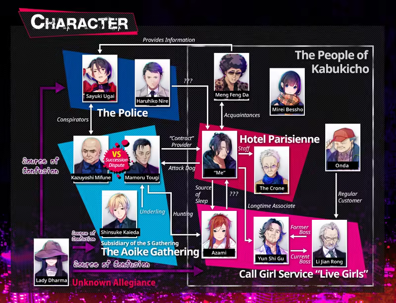 The leading subordinate of the Aoike Gathering, the secondary organization under the large-area designated yakuza group known as the S Gathering that rules Kabukicho. A rising star in the organization, he’s one of the candidates to become the leader of the Aoike Gathering. He’s a man of few words and great restraint with the ruthlessness to kill anyone without hesitation should it be required.