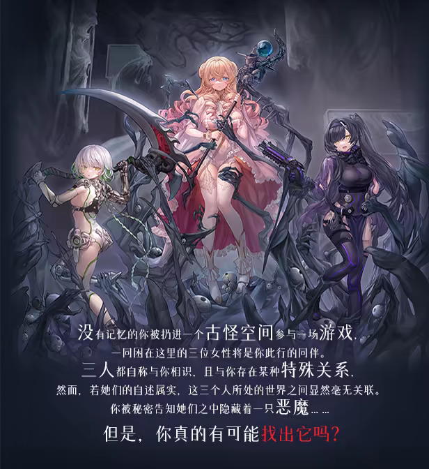 这里没有为你专门安排的房间,因此你每天都只能选择与一位女主角同宿。这是你调查恶魔的绝佳机会,你可以通过提出或回答问题来了解她们,进入她们的梦境,偷听她们的梦呓,寻找恶魔可能存在的破绽。