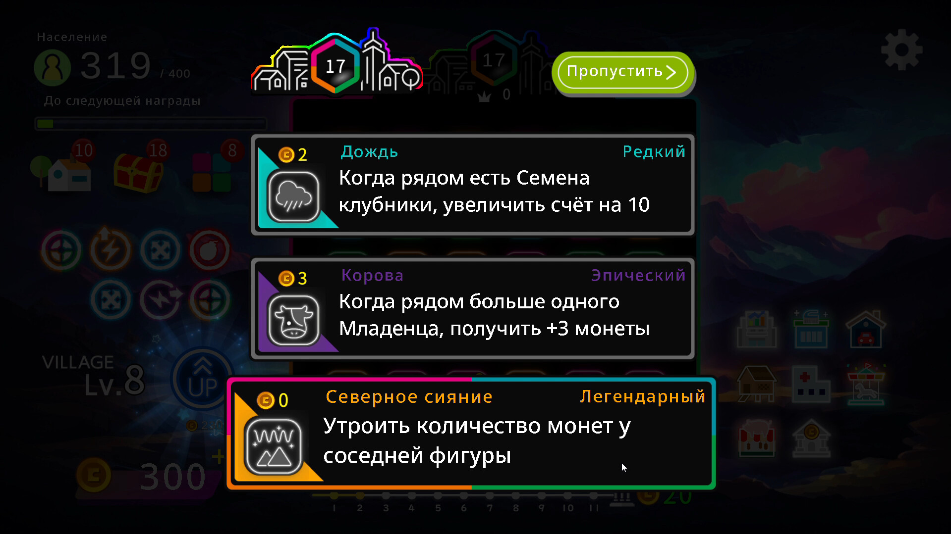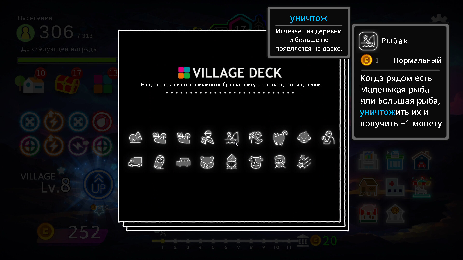 Эта игра представляет собой смесь жанров 'рогалик-конструктор колод' и 'игра "три в ряд"'. Собирайте уникальных жителей для создания взрывных синергий и развивайте сверкающую неоном деревню!