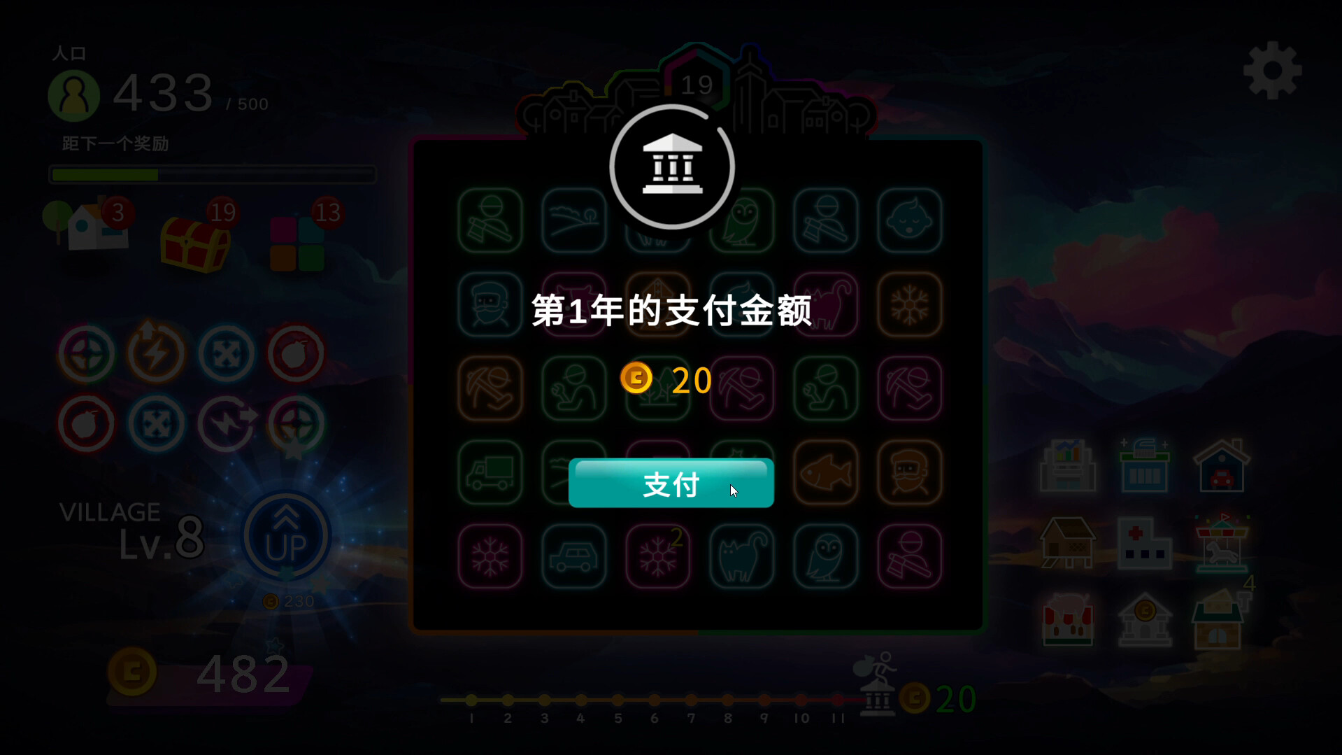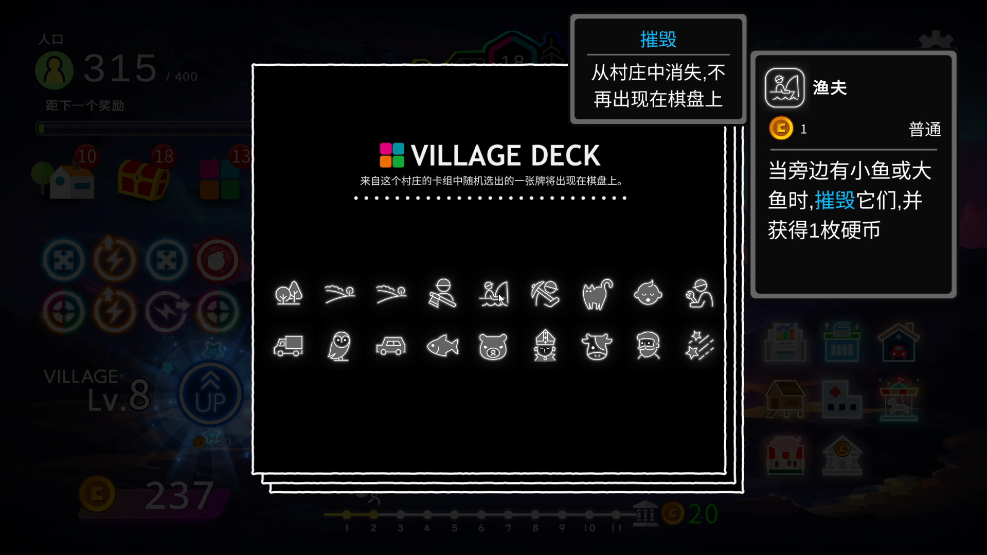 这款游戏是“策略模拟类roguelike游戏”与“三消益智”结合的游戏。收集个性丰富的居民,产生爆炸性的协同效应,发展闪烁着霓虹的村庄!