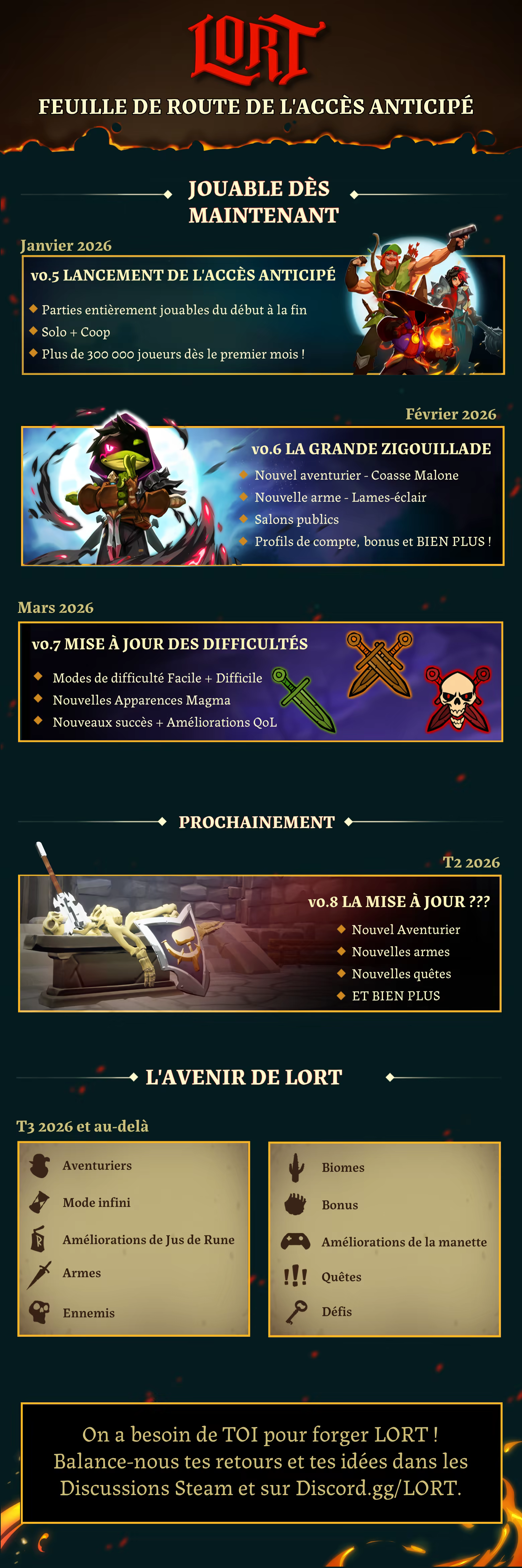 « La version complète proposera du nouveau contenu qui apportera plus de variété et de rejouabilité à vos parties. Au programme : davantage de classes de joueur, d'armes, de bonus, de fonctionnalités, et plus encore. Vous trouverez plus d'infos sur notre feuille de route sur la page Steam de LORT. »