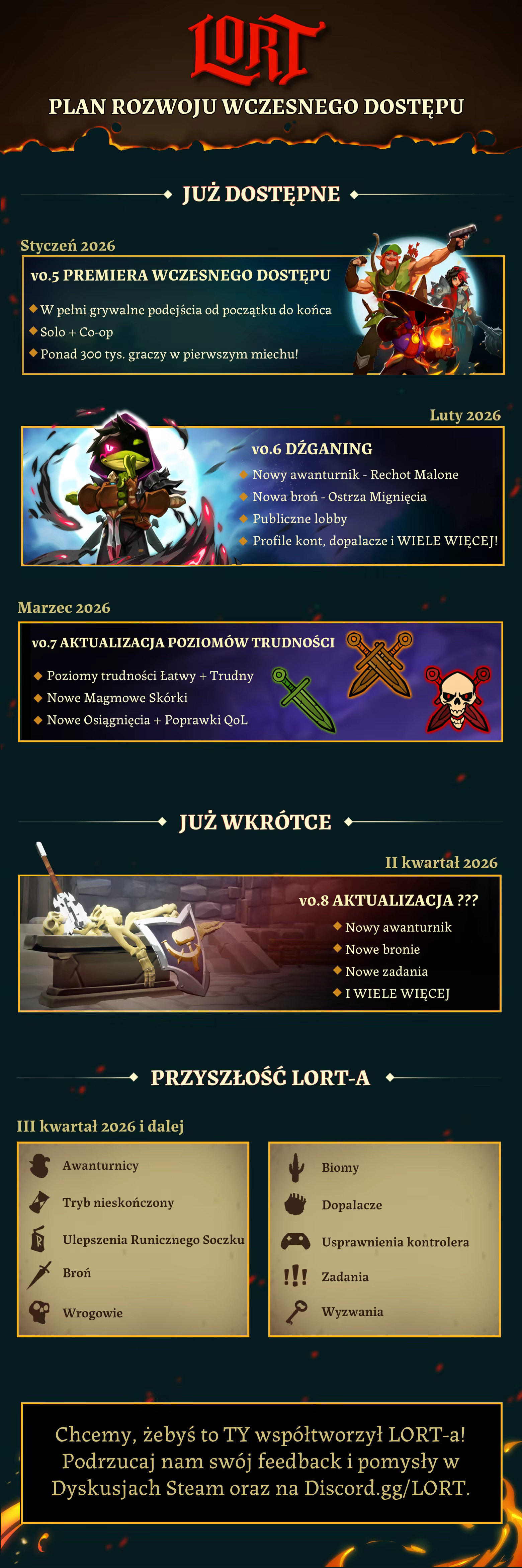 „Wsłuchiwanie się в głos naszej społeczności jest kluczowe dla przyszłości i sukcesu LORT. Dlatego na bieżąco śledzimy dyskusje na naszym serwerze Discord oraz na forum Steam, aby jak najlepiej zrozumieć oczekiwania graczy. To właśnie na podstawie Waszych opinii, zebranych podczas testów wersji demo, wprowadziliśmy już zmiany w naszym planie rozwoju.”
