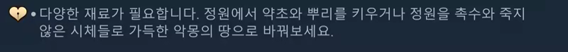 방문자들은 당신을 찾아와 조언을 구하거나 문제를 해결할 수 있는 물약을 구입합니다. 이들에게 도움을 주시겠습니까? 최종적으로는 방문자들을 속이거나 설득할 수도, (가장 큰 이익이 되는 쪽이 어디냐에 따라) 빛이나 어둠으로 유도할 수도, 힘으로 굴복시킬 수도, 친절함으로 마음을 얻을 수도 있습니다. 당신의 이야기이니 당신의 뜻대로 하세요! 모든 치료 물약이 고귀한 목적으로 사용되는 것도 아니고, 촉수로 엉킨 존재가 항상 방문자들을 괴물로 바꾸지도 않습니다.