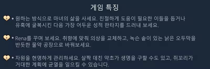 힘과 영광, 두려움과 용기, 명예와 기만, 하지만 이것만으로는 마녀 모자를 쓰고 솥 앞에 선 누군가를 표현하기 부족합니다. 물약은 무한한 가능성을 열어줍니다. Rena가 가는 길을 선택하기만 하세요.
