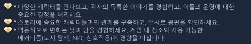 게임에는 폭력적인 장면, 외설적인 콘텐츠, 성인의 언어와 주제가 담겨 있으므로 모든 연령에 적합하지 않습니다. 특별한(에로틱한) 장면 속의 모든 캐릭터는 성인입니다.