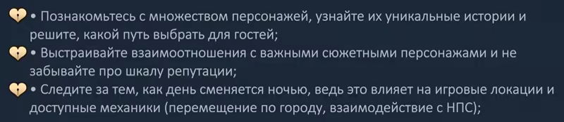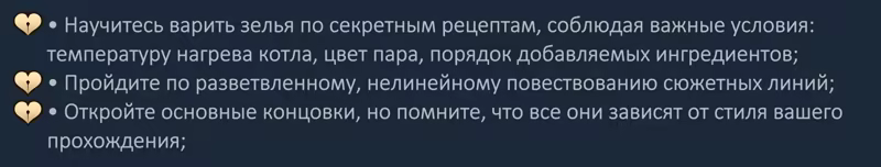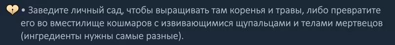 К вам будут приходить посетители, чтобы попросить совета или купить зелье, которое решит их проблемы. Но захотите ли вы их решать? Ведь всегда можно обмануть или переубедить гостя, склонить на темную или светлую сторону (в зависимости от того, каким путем вы идете и что принесет большую выгоду), заставить служить себе силой или привлечь добрым делом. Никто вас не осудит, ведь это ваша история! И не всегда исцеляющее зелье будет служить благому делу, а ворох щупалец не превратит гостя в истинное чудовище.