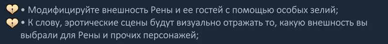 The game includes sexual scenes unlocked through quest progression, all of which are story-driven. These include: classic sex, oral encounters, furry content, tentacle scenes, and futanari.