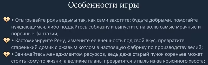 Власть и слава, страх и отвага, честь и подлость – это лишь пустые слова для того, кто надел ведьминскую шляпу и встал возле котла. Ваше ремесло открывает много возможностей, стоит лишь выбрать, по какому пути отправится Рена.
